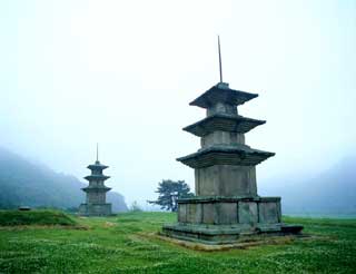 感恩寺是统一三国[ 7世纪后半期,新罗消灭百济和高句丽统一三国,建立统一国家]的新罗[新罗/57BC~AD 935]文武王[文武王,在位AD661~681]修建的寺庙。现在除了高达13.4米的两个石塔外已经全部被焚毁。 感恩寺是文武王为了借助佛祖的庇佑之力赶走日本海盗的侵袭而开始修建的。但是文武王还没有亲眼看到感恩寺竣工就驾崩,他在遗言中要求将自己埋葬在距感恩寺500米远的东海, 希望自己死后化为东海中的一条龙继续保卫国家. 因此,文武王被水葬在感恩寺附近的东海,寺名是文武王之子神文王[神文王,在位AD 81~692]在AD 682年寺庙竣工时为感谢父亲的恩惠而命名为[感恩寺]的.