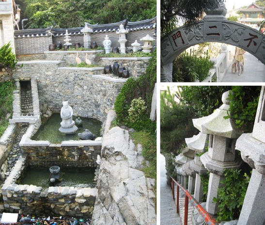 龙宫寺最特别的景致当属108阶和日出岩。从龙宫寺入口必须下108阶才能来到寺庙,而日出岩就位于108阶中间。站在岩石上可以聆听到海浪拍打岩壁的声音,欣赏日出的壮观美景。每当新年,不少人都来到这里面对日出许下心愿。而农历4月时,龙宫寺入口樱花繁盛。到了释迦摩尼诞辰, 寺庙被电灯装扮起来,呈现出幻想般美丽的夜景。