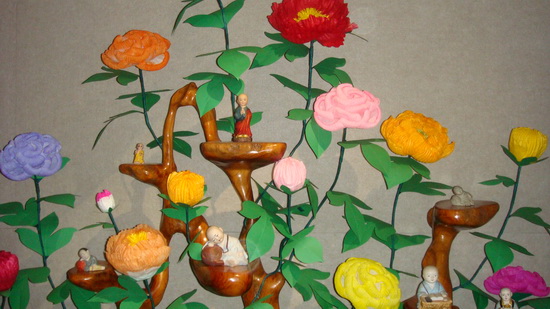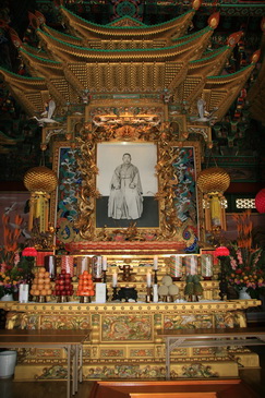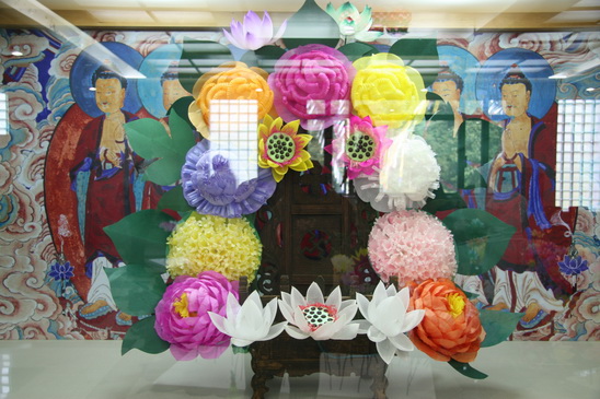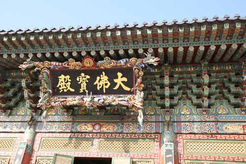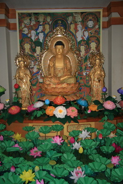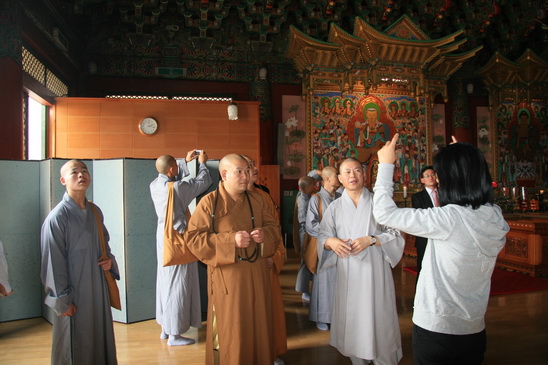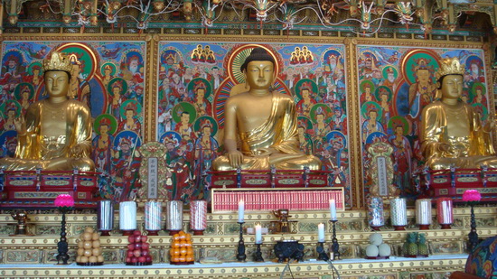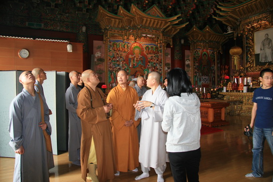 玉佛宝殿供奉的观音菩萨和三千玉佛,都是用缅甸白玉雕琢而成的。七层是大佛宝殿,采用了韩国传统的七梁瓦房的造型形式,加上传统的金箔丹青的装饰,更显得庄严绚丽。大殿中间供奉的是释迦牟尼佛,左侧是观世音菩萨,右侧是大势至菩萨,两边绘有三身佛和五十三尊佛的帧画。置身其间,让人体会到佛法世界的庄严胜妙。