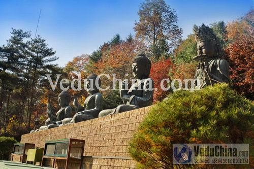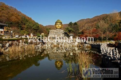 本寺院作为佛教涅盘宗本山(佛教一派系)的本总寺,现在收藏有3,000余件佛像,都是由主持海德法师巡访中国、斯里兰卡、缅甸等国家时亲自收集的。在寺院众多佛像中,最有名的是位于寺院入口处的佛头像(释迦牟尼头像)和横卧于山腰中的卧佛。高达8米的佛头像,曾被人载入吉尼斯世界纪录。这一头像是今后将建成的高达100米的佛像的头像。卧佛也为世界之冠,高达3米,长达12米,是用印度进口的香木制作的。此外,还有历经7年,用汉白玉制作完成的释迦牟尼苦行像。其骨瘦如柴的身体与看透宇宙四海的目光,栩栩如生。