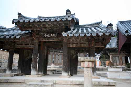 通度寺(Tongdosa Temple)位于鹫栖山南部,由于法堂内供奉着菩萨的真身舍利,因而没有再安放佛像,这也是通度寺闻名的原因。通度寺名字的意思是通达佛法,济度众生。唐朝的慈藏律师持释伽如来的真身舍利而来,于善德女王末年(646年)创建了此寺。通度寺经过多次战争和入侵,至今已1300年,但据说其法灯从未灭过。寺内有35座建筑及法塔等,周围有14座庵院。大雄殿被指定为第290号国宝,殿内没有供奉佛像。此外还有19处地方宝物及794件地方文化遗产,可谓是一处博物馆。大雄殿没有供奉佛像,但其后的金刚台阶上却供奉着封存的释伽牟尼的真身舍利。