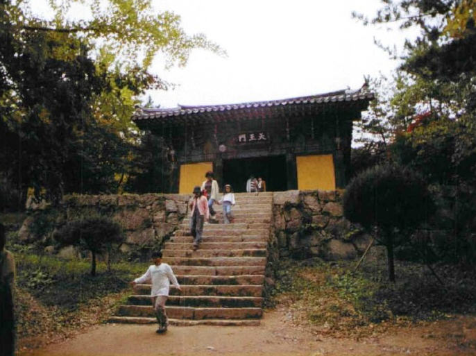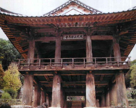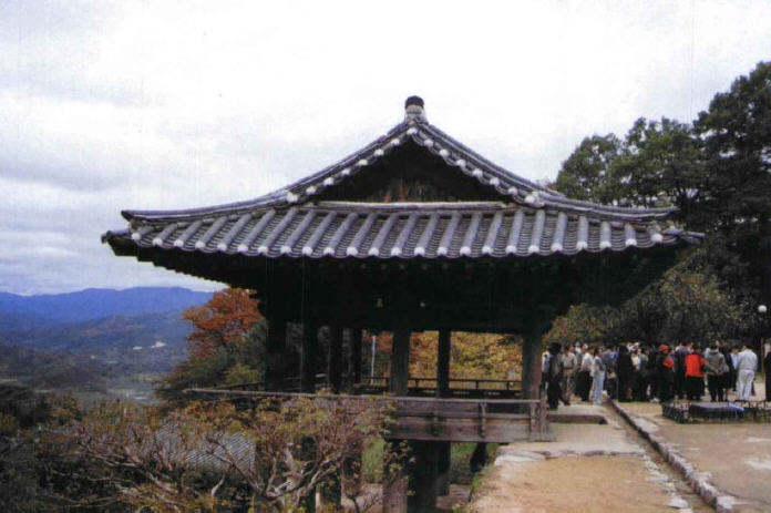 过天王门,顺山势而上,是正位于中轴线上的两层楼阁—梵钟阁。阁前双石塔对峙,为早期寺院常用之布局。梵钟阁补间扶壁拱一攒柱头斗拱出一跳,牛舌昂,耍头呈下弯的牛舌状,为韩国古建筑之独有样式。底层立柱粗大,直径一米左右,直接支立在天然石础之上;二层柱叉立在底层立柱之上,属《营造法式》记载的楼阁建筑“叉柱造”。其平坐寻杖交角造;