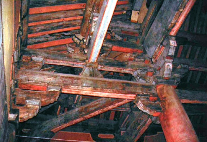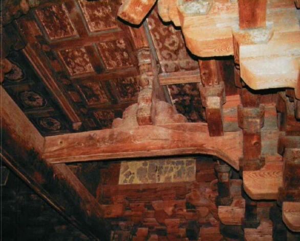 栏杆外侧立柱做法,与《营造法式》所载的“栏槛钩窗”下部的托脚相类似,曾见于我国宋代郭忠恕《雪雾江行图》中。这是笔者所见在我国皖南部分民居中尚存此实物之外的罕有实例。二层室内安放大鼓、铜磐。此楼兼具钟楼和鼓楼的两种功用,应是我国唐初期以前寺院钟鼓楼合一布局的遗制。梵钟阁屋顶颇为特殊,前为歇山、山面向前,后为悬山依托山岩,巧妙地利用地势高差,由上部山崖可直接进入阁内二层,颇具匠心。此外,梵钟阁二层梁架上残留部分彩画,以青绿为主,较为难得。