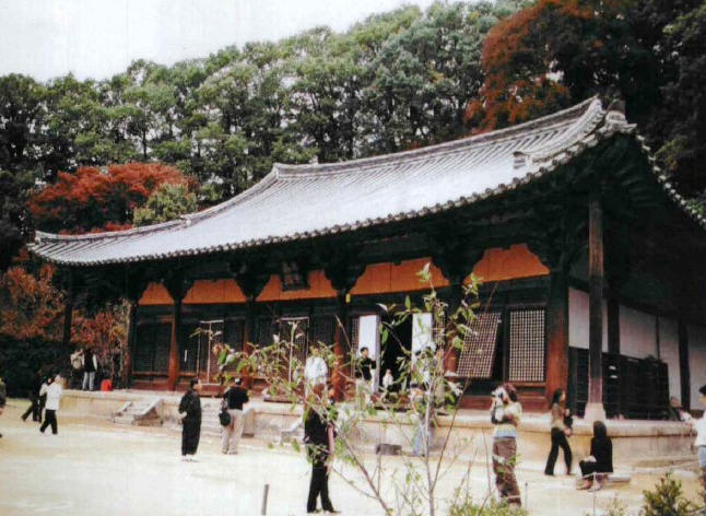 郑柄朝先生在《韩国佛教的思想特征—以新罗末期、高丽初期为中心》一文中也认为,义湘创建浮石寺之初,就有意“将其变成实现净土信仰的道场,并进而使新罗也得以净土”。因此,作为净土信仰代表的阿弥陀佛成为无量寿殿内的主尊。且郑先生认为“对于义湘来说,浮石寺的无量寿殿就是他所见到的观音菩萨之真影,净土是他效行观音行化的依据”。当然,9世纪以后,韩国许多寺庙又奉华严经原本的毗卢舍那佛为主尊,如海印寺、法水寺、崇福寺及佛国寺等。