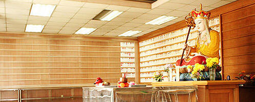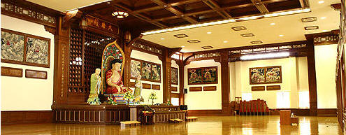 大雄殿位于檀香大楼最高一层,走出电梯,经过长廊,进入殿中,一尊由樟木雕成的释迦牟尼佛,目光慈祥,静穆安详,镇坐于大殿中央,流露出佛陀慈悲的圣德,摄受和接引前来参拜的善信。