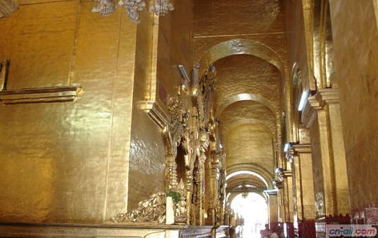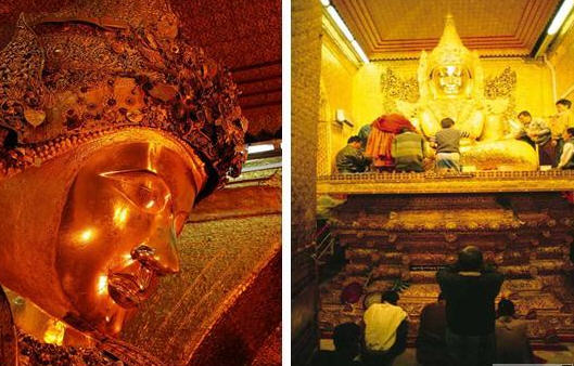 缅甸摩诃牟尼佛寺庙(Mahamuni Pagoda也称马哈木尼佛塔)也是缅甸最有名望最具神力的佛塔之一。这尊释迦牟尼佛像请自若开帮,几经周转才来到了曼德勒。自古代以来都非常受缅甸国王和人民的礼拜。除了佛身高纯度金外,佛陀的礼冠上缀满了历代人民布施给佛主的珠宝钻石,无一不价值连城。神奇的是,佛面无论从哪个角度看始终是微笑的。