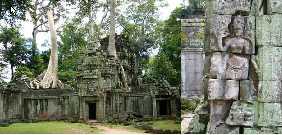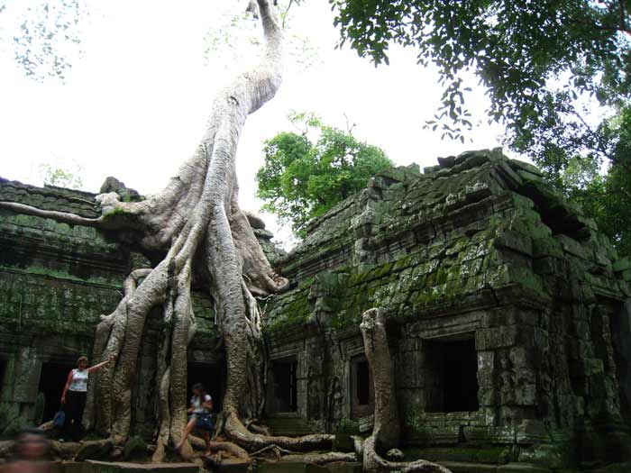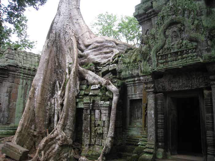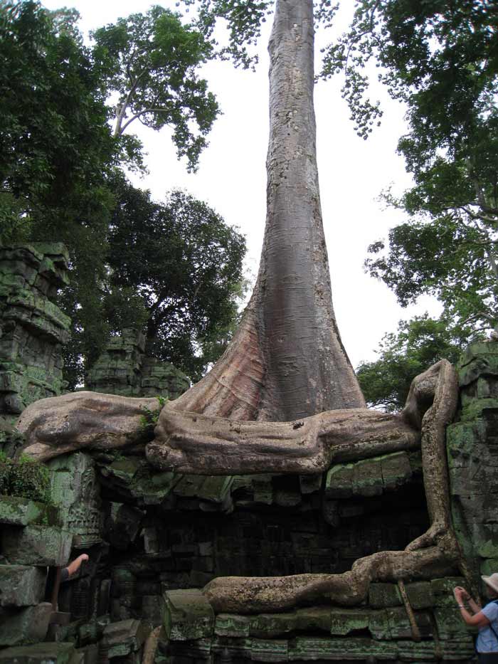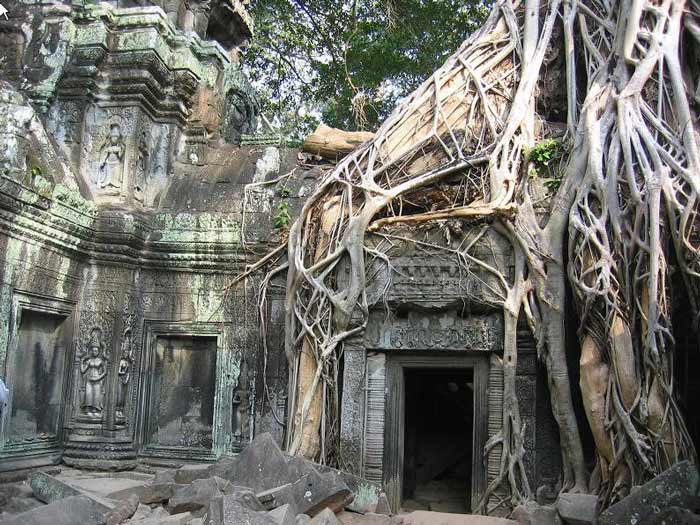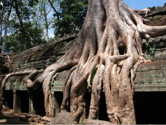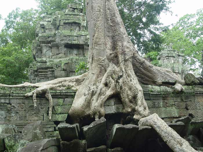 巨树在庙的空隙间盘根错节生长,种子遇水发芽生命力强,鸟类啄食树的果实将种子分布在神殿各处,树根深入建筑的石缝中向四方扩散,巨根抓紧破庙,这也见证了吴哥文明的衰亡败落的时光。当年法国人据说就因为树根盘根错节的太严重,决定放弃整修,只稍加修葺让他保持原貌。于是形成今日被巨大树根盘踞的神庙。