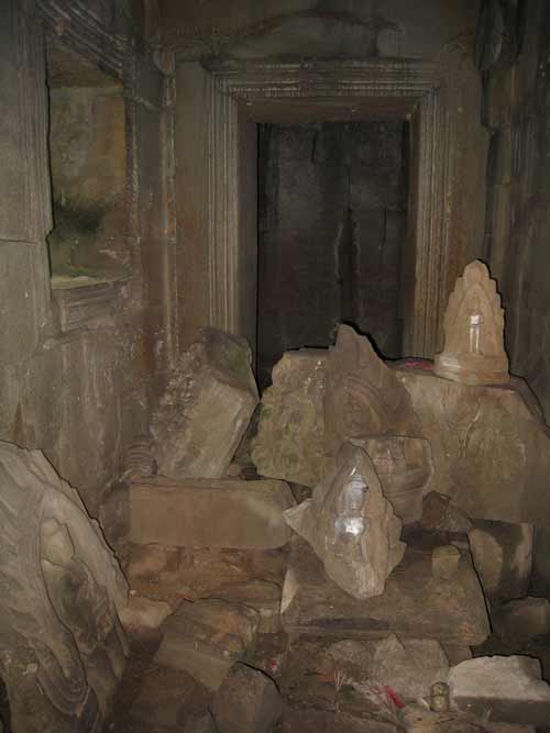 入口处,迎面耸立的是一尊高大的四面佛,进了城门,其实还看不到古迹,感觉是像走进一片密林之中,顺着小路走往塔普伦寺的路旁,有一棵树身有二、三十公尺高,树干上有被烧焦一大块的怪树,据说,这是一种当地人称它为「油树」的植物,烧它的原因,是要让它滴出油来当做点灯的燃料,而且只要不过度,它就可以源源不绝,就像是一座天然的加油站。