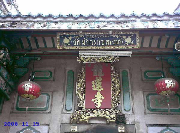 龙莲寺位于曼谷唐人街上,于公元1871年修建,建筑属于木石结构三重院式。整个寺院按照中式禅院的传统规范布局,一进入大门,来到正殿前,便见大门上端悬着一竖匾:写着“龙莲寺”。门旁有一副对联:“龙势飞腾地,莲灯照耀天”。这些飘逸遒劲的行书是清光绪五年,龙莲寺的开山祖师、住持续行敬题并书的。寺庙的屋脊上、飞檐上都是典型的中式雕塑,走进庙里,仿佛置身于中国的庙宇。