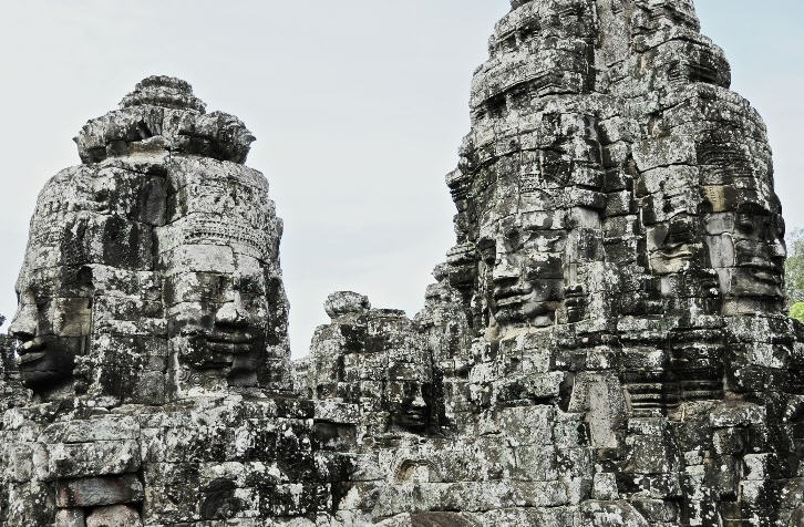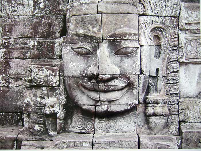 鉴于先前被占城入侵的惨痛经验,阇耶跋摩七世 (Jayavarman VII) 将吴哥城城墙筑得特别高又厚实,城外建有护城河。吴哥城最外围是由3公尺的护城河,以及红土所建的8公尺高的城壁所包围着。外围有五座城门:南大门、北大门、西大门、死者门、胜利门。各城门是塔的造型,东西南北四面雕有观世音菩萨。最有名的当然是「高棉的微笑」,每一座塔四面都刻着阇耶跋摩七世的面容,与印度教大梵天不同的是,此乃象征眼观四路,耳听八方的佛菩萨,代表的是佛家的「慈、悲、喜、舍」四无量心。三公尺高的阇耶跋摩七世微笑面容,轩昂的眉宇、中稳的鼻梁、热情的厚唇、慈祥的气质,国王的微笑反而胜过建筑本身的宏伟,而成为旅客最深的印象,无怪会被其后代子孙尊称为「高棉的微笑」。
