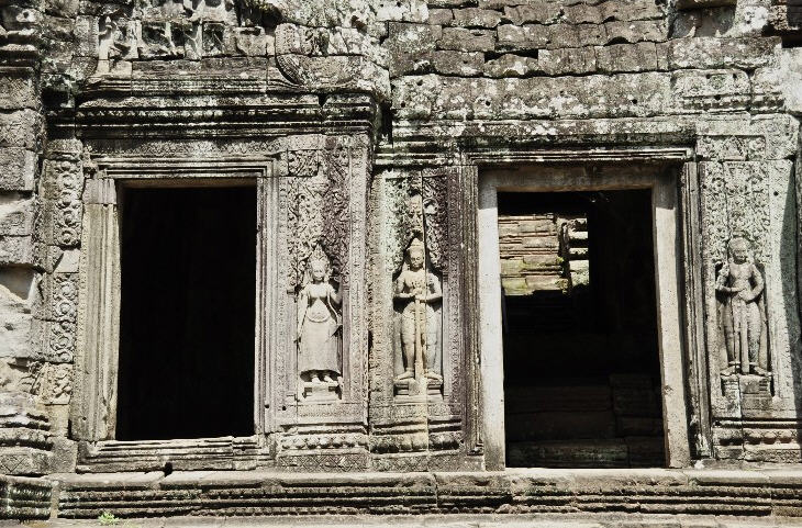 从巴戎寺 (Bayon) 的东门走入,步上台阶往前行,就是壁画回廊。墙面浮雕分为高、中、下三大条横层,分别描绘王室、将领、平民生活,以高度代表社会位阶,内容包括行军出征占婆人、凯旋而归、当时社会生活等情况。穿过回廊入内即到达中央主殿区域,然而途中却有许多迂迂回回、上上下下的通道。这里的浮雕分为内侧和外侧两个回廊,外侧是纪录当年吴哥战胜占婆的战争,以及当时的民生百态。内侧则是一些佛教故事,因为建筑吴哥城和巴戎寺 (Bayon) 的阇耶跋摩七世 (Jayavarman VII) ,是个虔诚的佛教徒。这世界上,可能有许多伟大的大型宗教建筑,可是很少有像巴戎寺 (Bayon) ,能够把百姓生活当作题材,阇耶跋摩七世的确是一位勤政爱民的君主。