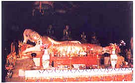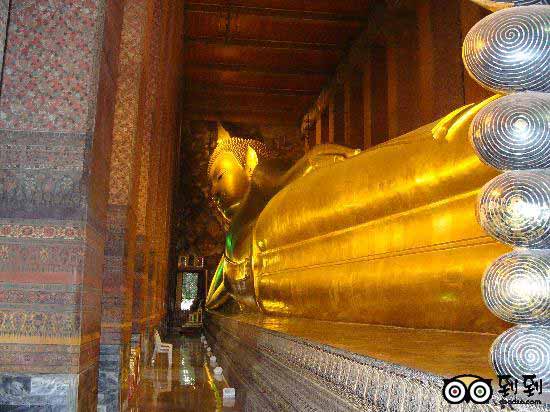 卧佛寺(涅盘寺)建于16世纪的大城时代,1781年时又经过了拉玛一世一番近乎更新的重建。它是曼谷最古老的寺庙,也是泰国最大的一座。恰图朋路(ThanonChethuphon)将此地一分为二,一边为该庙的建筑,另一边则是僧侣住宿的区域。该寺最吸引人的重点,就是那尊巨大的卧佛,它长46公尺,高15公尺,代表了临终的佛陀为达到涅盘而采取的一种躺卧姿势。这座塑像是19世纪拉玛三世在位时建造的,用上了漆的砖、灰泥和金箔做成。脚掌上以珍珠母,及佛陀的108种符号为装饰。