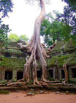 塔普伦寺(Ta Prohm)从十九世纪中叶法国人发现这群庙山之后,即因被树根茎干盘结地过份而放弃整修,保持了原始模样。阳光穿过树头,悄悄地从残破的屋顶伸入塔普伦寺庙内,然后像嬉游的灵魂般轻飞游移,一会儿驻足在无头神像上,一会儿憩息在墙上浮雕神祇中。隐身树中的山鸟啼咕出叩叩声,像是昔日僧侣敲打木鱼的残响,唤活了弥漫四野的邃古灵气。更令人深感震撼的是,结实雄大的榙普伦寺,竟被当地人称为蛇树的卡波克(Kapok)树所盘踞,它们粗壮发亮的根茎,绕过梁柱、探入石缝、盘绕在屋檐上、裹住窗门,深稳紧密地缚住神庙,以让枝干有力地向天攀升。由一颗不起眼的小种子开始,历经数百年的努力,而今卡波克葱茂的树叶就像祈神的臂膀,成功地伸向天际,与神庙争光,蔚为奇观,以至有些学者甚至认为这些树也应列入神庙历史的一部份而一并保护。