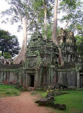 Enter the temple through the east gate. The long white sandy path between the outer gate and the inner sanctuary is courtesy of the film Tomb Raider. At the end of the trail is a typical ceremonial terrace in front of the large eastern gateway to the inner sanctuary. Past the grand gateway is a large court with galleries. Behind the court is another wall enclosing the central sanctuary. Passing through this wall brings you to the crowded courtyard with the walled central sanctuary in the center. At this point, I suggest you veer to the left, making your way around the southern wall of the central sanctuary, between it and a large enclosed annex built along the southern outer wall. This will bring you to the southwest corner of the courtyard. From here there is a good view of several large trees growing on the wall of the central sanctuary. There's even a mound of earth and stones near the outer wall that makes a good elevated spot to take a picture.
