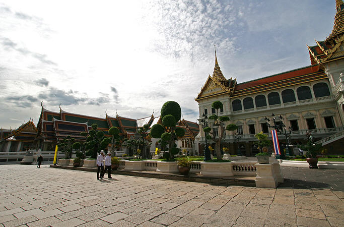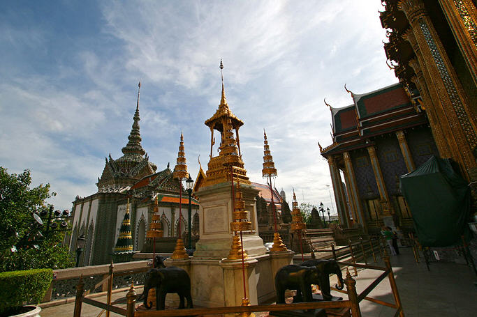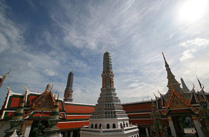 佛寺占地2.1万平方米,始建于1782年。以后历代君王对佛寺建筑都进行过修缮。共有大小22座寺庙,为泰国曼谷王族供奉玉佛和泰王举行登基加冕典礼及皇家举行佛教仪式、进行各种祭礼活动的场所。玉佛像前还供有不同造型的大小佛像。雕粱画栋,壁画满墙,使殿内气氛更加庄重、肃穆。寺外屹立着几米高的奇形怪状而威武庄严的守护神。