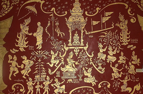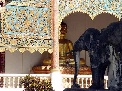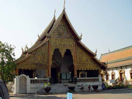 This is the first temple built in the city. It was constructed in 1296 by King Mengrai. It has been restored many times but the style is essentially the same. The entrance is guarded by Burmese style lions. The Viharn contains many Burmese features along with old Thai These is a veranda across the front with low hanging decorations between the front pillars which differs from the modern Thai style one sees in Bangkok. The design is one of golden angels and foliage on blue. The gable is one of the old northern Thai panel type, very artistic with touches of gold and red. There also is an intricately carved three-head elephant, Erawan, surmounted by a crown.