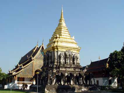 这座寺院最吸引人的建筑,就是有15只大象承载的佛塔,据说当年泰国北方还是一片丛林密布杂草丛生的地方,所有的生活所需,靠着船运或是利用大象搬运而来,因此大象为清迈的建城做出了巨大的贡献。在清迈的许多寺院里,到处都能看到大象的石雕。