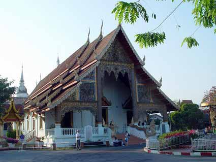 寺院中的一座莱卡僧院,重要的珍宝就是墙壁上的绘画,这些画以描绘早期北方的日常生活情景还有缅甸宫庭的状况。左面的壁画最近曾经重修,据说还是由一位中国艺术家负责修复的。菩兴寺的大殿,为典型的兰纳式,门与柱子同样装饰华丽。