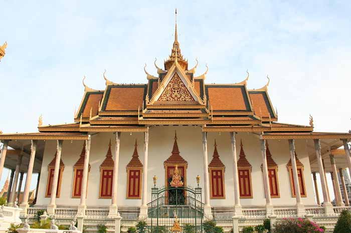 金银阁寺(Silver Pagoda)位于柬埔寨皇城南侧,建于1892年至1902年间,采用高棉传统建筑方式,但装饰带着强烈的暹逻风格。金银阁寺地板是由5329块各重1.125kg的纯银砖铺成,共5吨重,故称为银阁寺;又因寺内供奉玉佛又称玉佛寺;玉佛前有座重达 90 公斤的金佛,镶有2086颗钻石,佛冠上的主钻石重达25克拉。寺前是诺罗国王骑马雕像,周围环围诸位国王的灵塔,回廊有由 40 位艺术家绘制印度神话故事的壁画,精采绝伦。加上寺内数百件国宝级金银宝物,所以又称为金银阁寺。寺中央有一座18k金打造的佛像,重90kg,佛身上镶有9584颗钻石,最大的一颗镶在佛身胸前,重25克拉。这尊佛像是为了纪念西索瓦国王打造的。