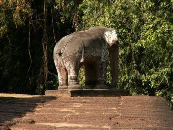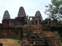 东湄本寺 (East Mebon) 。 这座寺庙是罗贞陀罗跋摩二世(Rajendravarman II) 于十世纪中兴建,大象石雕大象石雕是用来祭祀印度神湿婆,以及国王的双亲。原本是位于一个七公里长,二公里宽的人工水库,即东巴莱湖 (East Baray)中央,不过湖水早已乾,水库的范围已变成农田了。东湄本它的坐落显示了高棉建筑师很注重方位。东湄本寺建在用红色砂岩砌成的三层台阶之上,台阶四角都有大象石雕,而且保存得比较完好。五座砖砌的宝塔竖立在顶层台阶之上,塔身多有损毁,而其他建筑亦大都倒塌,只余石雕的门框和廊柱在勉强支撑著。砖砌的塔身上布满鸡蛋般大小的圆孔,这些圆孔可能是镶嵌了宝石,又或是为了牢固原本覆盖在塔身面层的灰泥。大量的密密麻麻的圆孔都镶嵌了鸡蛋般大宝石,那些洞本来是用来作为固定灰泥之用的。塔上的门楣及大象雕刻,是值得欣赏的地方。