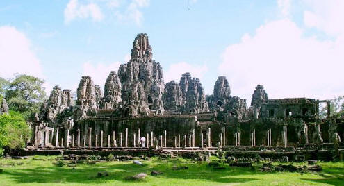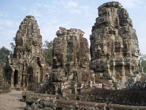 吴哥城内最为出名的要数巴戎庙中的佛塔了,巴戎庙位于吴哥城的中心位置,巴戎庙是由一组共49座小宝塔围绕中央尖塔构成的建筑群,这些塔在佛语里又被称做浮屠,每一座塔的四面都雕刻着巨大的佛面,也正因为如此,这些塔又被称作佛面塔,上面的佛被称为四面佛。四面佛的四个面分别代表了慈、悲、喜、舍四种无量之心,其中喜悲皆不形于色,表情安详,却又各不相同,略带微笑的面孔中还透出几分神秘,给人们留下无限遐想。