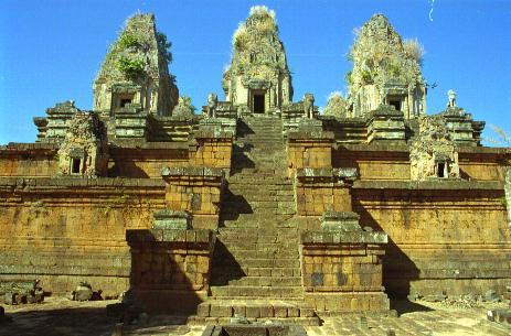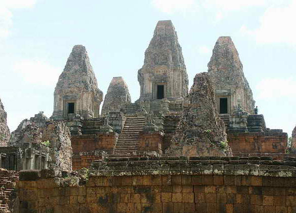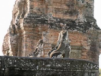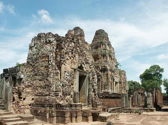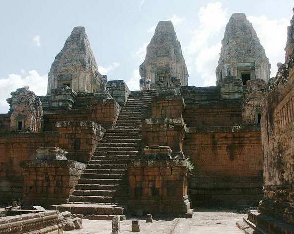 比粒寺(Pre Rup)是罗贞陀罗跋摩二世(Rajendravarma II )建于10世纪下半叶,是用来石狮子仰天站在变身塔前为古代皇族火化变身为神之神殿,举行已逝国王火葬仪式的寺庙,又称变身塔。比粒寺是典型的“塔山”风格,基座上建造砖塔。其基座为砖红壤,上一楼贴的是石阶,上层为砖塔。石阶上面有很多洞洞,并不是风干所致,而是砖红壤干后自然形成的。 至今仍可看到烧焦过的痕迹,千年前在此举行仪式,达官云集,不能随便进入。变身塔是典型塔山建筑,它的结构与塔松寺(Ta Som)很相似,因属红砖结构,在夕阳照耀下泛着暖暖的红; 加之这里开阔的视野,吸引着一些游客在此看日落。经过千年岁月沧桑,塔基座下石狮子仍然忠实地守候着这片寺庙。