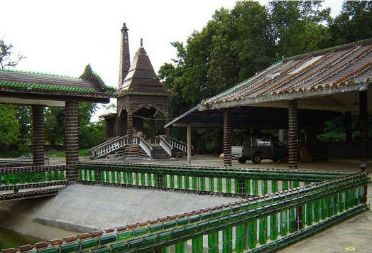 这座用啤酒瓶搭建的寺庙名叫“Wat Pa Maha Chedi Kaew”,位于首都曼谷东北640公里、四色菊府靠近柬埔寨边境处,又被称为“百万瓶寺”。