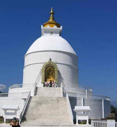世界和平塔(World Peace Pagoda)是一座白色钟形塔,是观雪山关日落的好地方。建成于世纪之交的2000年。这里景致绝佳,除了可以看到背面的安纳普纳雪山外,还可以俯瞰山下的费娃湖秀美风光。
