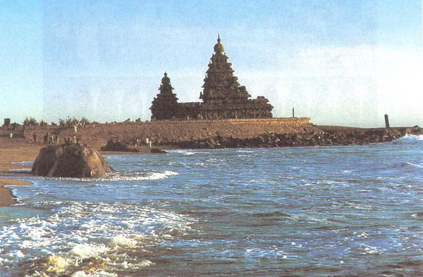 庙宇由大厅和神堂上的两座高塔组成,不是整块巨石雕琢而成,而是采用花岗岩石块构筑,体现了建筑工程技术高。最大的塔高出水面16米,作为再生神湿婆的本体,塔身布满死亡和他的雕刻。前面的小塔为守护神毗湿奴的本体,同样刻满了密密麻麻的雕像。两塔之间的小型神堂供有男性生殖器像,面朝西方。两座高塔均呈方锥形,线条高耸陡峭。神庙前有一条圣羊夹道的神路,于古埃及阿蒙神庙前的圣羊神路非常相像,只不过,这里的圣羊是面迎来者的。海滨庙的基底深入海水,整座庙宇扰如一座海上漂浮的圣所,汲取了天海合一的自然神息。