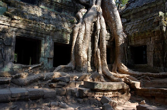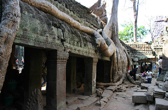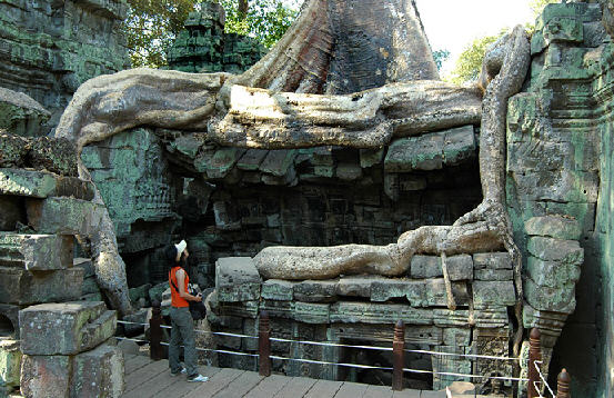 经过七百年的风云变幻,早已衰败的古城被法国人偶然发现,但是古寺昔日风采不在,就连百年古树也要与它争夺地盘,古老的石墙与回廊早已被树根穿透,古寺只得在大树的根部苟延残喘,坚持着不被压垮。树根的盘绕与古寺的坚持成为一种鲜明的对比,也带给世人一个震惊。在好莱坞电影《古墓丽影》中那些震撼人的照片就是在这里拍摄的,这也是很多影迷前来感受神秘气息的原因之一。