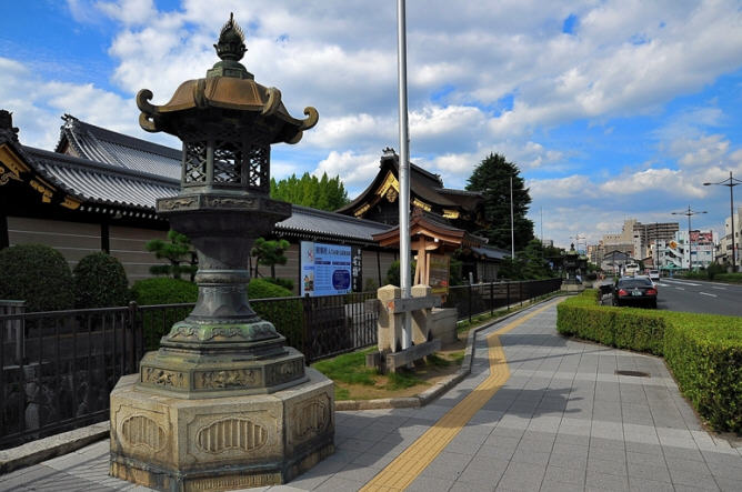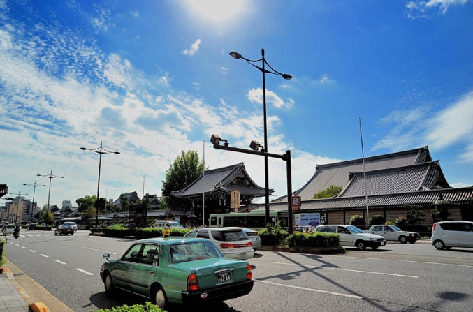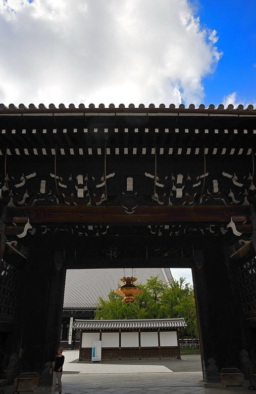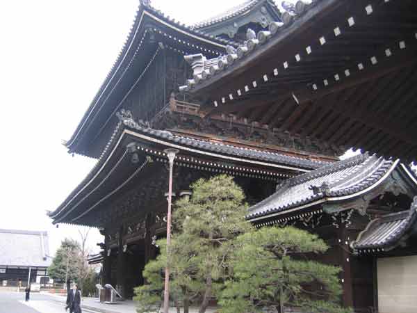 本愿寺宏伟的建筑群和宽畅的砾石广场与其显得较为简朴的入口大门形成了鲜明的对比。