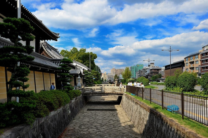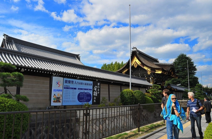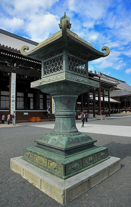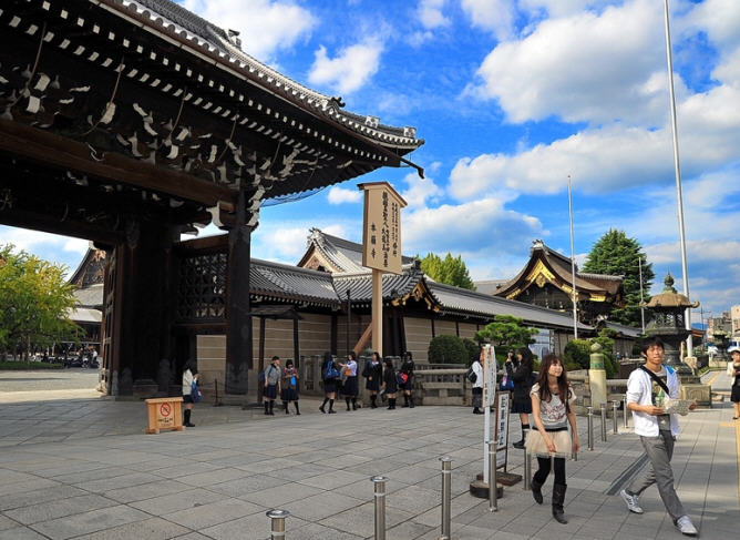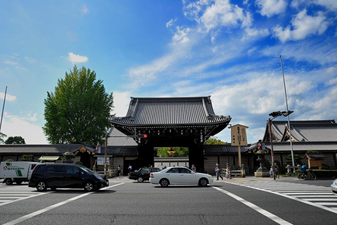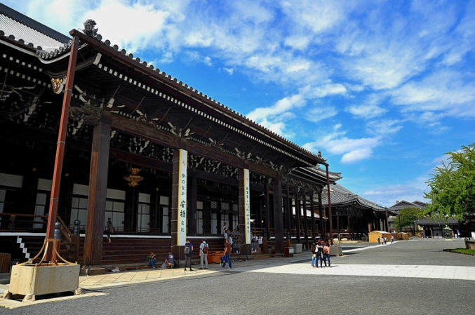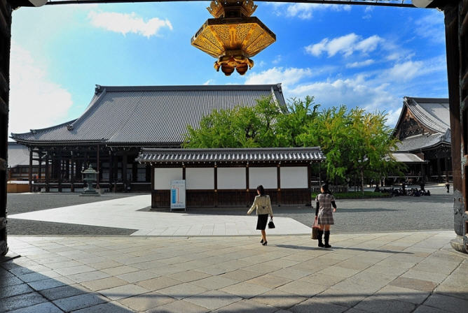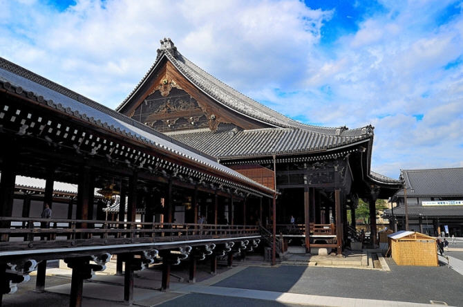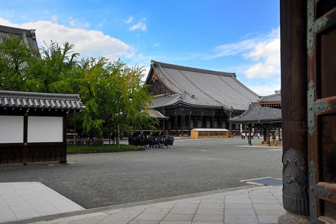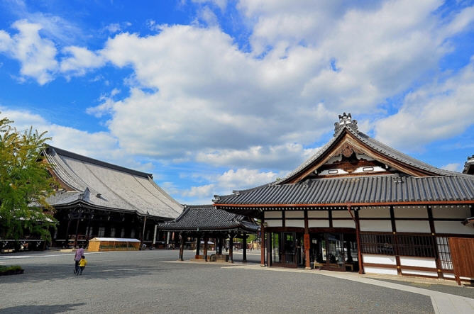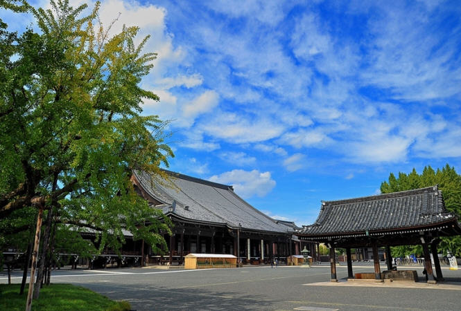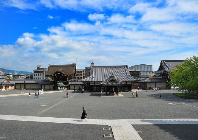 著名的本愿寺两堂即为广场右边的御影堂(本愿寺的缔造性建筑)和广场左边的阿弥陀堂。其中,御影堂为僧侣和信徒们的聚集地。此外,本愿寺的其它建筑:唐门、日本最古老的北能舞台、书院、黑书院、飞云阁(国宝)等均是炫丽桃山文化的精华荟萃。