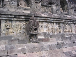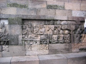 婆罗浮屠的塔底,通常称为“隐基脚”,由于用大量的石块在其周围筑了一道防护墙,因而遮挡了人们的视线,当初大概是为了使尚未竣工的佛塔不致因地基不隐而倒塌。装饰塔底的是160幅非同寻常的浮雕,1885年才发现,展出一段时间后,除东南角外,又都被重新掩盖。浮雕题材依据佛经的天、人、畜生、地狱等六道轮回,阐明了“业障”的作用,即因果的规律,将经变和世俗人物与热带花草和鸟兽结合起来。