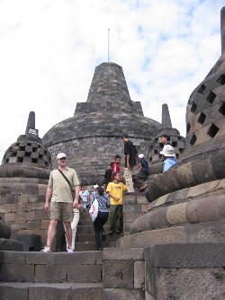 婆罗浮屠位于爪哇岛中部日惹西北约40公里处默拉皮火山的一个山丘上,是印度尼西亚的佛教建筑和雕刻的杰出代表。婆罗浮屠的梵文意思就是“山丘上的佛寺”,它的周围另有四座火山。婆罗浮屠一直被人们称为“南半球最大、最古老和最壮观的古迹,其工程之浩大,建筑之壮观,可与中国的长城、埃及的金字塔以及柬埔寨的吴哥古迹相媲美,被世人共誉为古代东方的四大奇迹。