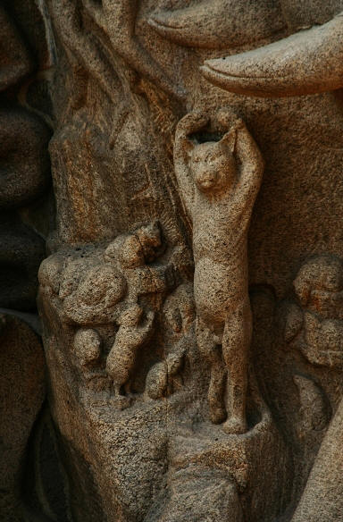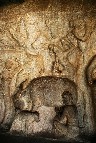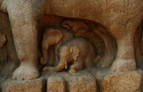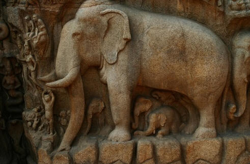 该城过去曾是海港,曾发现过中国、波斯和罗马的古币。马哈巴利普拉姆建筑是7至8世纪期间,帕那瓦国王们沿着科罗曼德尔海岸开辟岩石而建的。其中特别著名的有战车形式的庙宇,名为“恒河的起源”的巨大露天浮雕和里瓦治寺院。马哈巴利普拉姆浮雕凿刻在海边两块高达60米的巨岩上,讲的是与《罗摩衍那》并称为印度两大史诗的《摩柯婆罗多》中的英雄阿朱那的故事。有形象生动的神灵、魔鬼和动物的图像100多幅。建筑物上数以千计的雕刻表现信徒们对湿婆神的崇拜。沿海岸线布满了令人眼花缭乱的鹅卵石,形成了奇特的鹅卵石风景线。