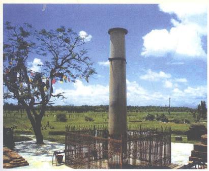公元前251年,也就是佛陀涅槃200多年后,古印度孔雀王朝第三代君主阿育王与其戒师优婆掘多等来蓝毗尼巡拜佛迹,并于公元前245年建石柱纪念。石柱上刻有阿育王的敕文,内容是:“天爱喜见王(即阿育王)于灌顶即位的第20年,亲自来蓝毗尼恭敬礼拜。证实此处为佛陀诞生之地后,敕令于此雕凿竖立巨大石柱,并用石栏围护。因为无上正遍知出生于此,特谕减免蓝毗尼村税赋,仅缴收入的1/8。”据考古研究,最初建成的阿育王石柱总高约13米,埋入地下2米多,柱顶近3米,中间柱身7米多,周长2米多。柱顶由3部分组成,最下部与柱身连接处为圆柱体,四周雕有条状花瓣;中间为正方体,四周也雕有花纹;顶部雕有一匹马。