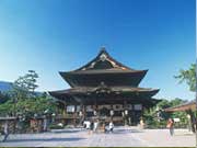 善光寺,据说创建于 7 世纪,是长野市的观光中心,来自日本全国的参拜者络绎不绝。穿过大门的仁五门,便可看到在参道尽头的高约 20 米的山门。此山门被指定为国家级重要文化遗产。本堂的用丝柏树皮葺顶的屋顶呈双重结构,其正面挂的“善光寺”三个字的笔画是以鸽子模样写成的,其声名远播。山门深处的本堂被指定为国宝,是重建于 1707 年的规模属日本第三的木结构建筑物。