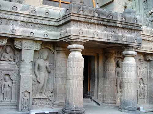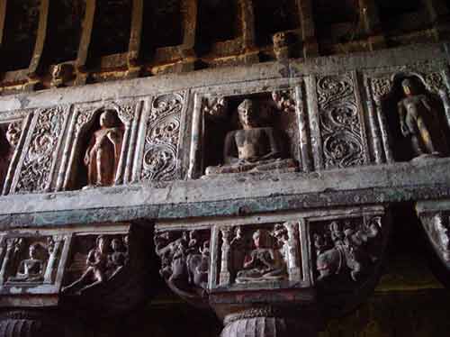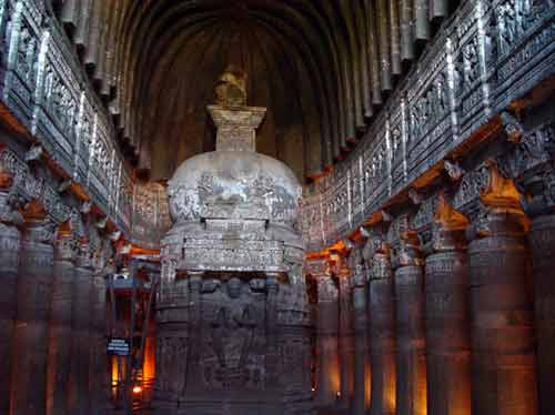当年在陡峭的悬崖上开凿洞窟时,并没有预定的计划,开凿者们只能各自在河畔沿着在岩石上凿成的石阶登上峭壁进行工作。在总共30个洞窟中(其中一些没有完成),5个(9号、1O号、19号、26号和29号窟)是佛塔殿,其余皆为寺庙。佛塔殿的特征是拱形天顶,正面为宽大的方窗;后部穹窿的中央放置着信徒们祭拜的供品。寺庙则由两部分组成:宽敞的大殿供信徒们修行礼拜;大殿四周是三排禅房,为修行人们的居所。