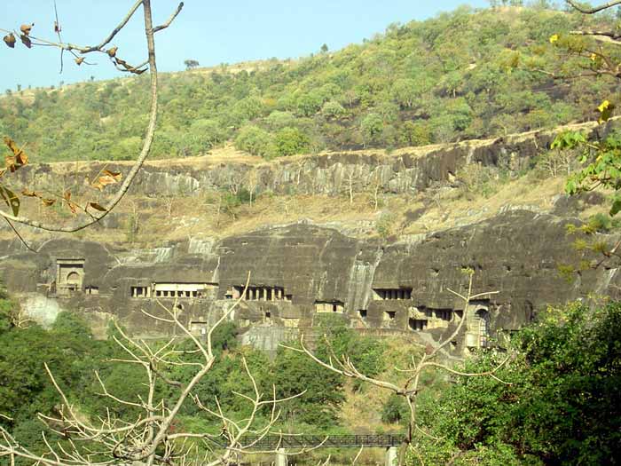 Ajanta Caves石窟主要由举行佛教仪式的支提窟与供僧侣修行用的精舍组成,共有29座石窟。一号石窟的释迦牟尼雕像正面表现沉思、左面表现微笑、后面表现凝视,其拱门及石柱上雕刻有飞天仙女,大厅墙壁绘有五百