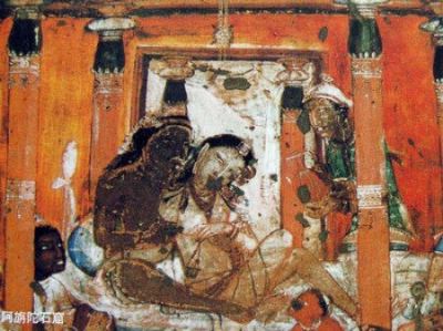壁画 阿旃陀石窟的壁画,更为世界所瞩目,是印度古代壁画的主要代表。根据时代风格区别,亦分为早、中、晚3期。早期的壁画最古,第9窟前壁残迹中,绘有佛传和佛本生故事,第10窟的右壁绘有索姆、六牙白象本生和礼拜菩提树等佛教题材的壁画,推测约作于公元前1世纪。两窟画风不同,而能各尽其妙,前者使用的线条,柔和纯朴;后者大胆运笔,风格豪放。此期壁画的构图,大多为横幅长条形,所表现的人物和生活场面,与约公元前 2世纪的帕鲁德、等石刻佛教遗迹相似,可证其距佛教美术史的初期作品为时不远,但造型能力、表现技法,已有长足的进步。