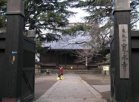 位于东京都台东区上野。为日本天台宗门迹寺(显贵出家所住止之寺院)。天台宗三山之一。山号东睿山圆顿院。沙门天海奉德川家康之命,改川越喜多院为天台宗之关东总本山,号东睿山喜多院。宽永二年(1625),在相当于江户城之鬼门地方(即现址)营造大伽蓝,型制模仿比睿山延历寺,其不忍池即琵琶湖之翻版,辩才天堂即仿竹生岛,并仿京都东山清水寺观音堂造立观音堂,移来东睿山号,并仿延历寺之以年号为寺名,而称宽永寺。后兼为日光轮王寺之门迹。又与东京芝公园之增上寺同为历代将军之灵庙,两寺轮流行祭,并另行建筑东照宫。元禄时代,以竹之台(今日本博物馆前广场)之中堂(琉璃殿)为中心,盛极一时。子院有三十五处,遍布上野山。明治元年(1868)因彰义队之战乱,寺宇多遭焚毁,仅存供奉天海与良源两大师之慈眼堂、灵庙(于第二次世界大 战中烧毁)、东照宫、五重塔、本坊表门(黑门,移建于两大师前)等,广大之寺域大多变成为上野公园,现今之本堂乃明治年间自喜多院移建而成者。[日本高僧传卷五十六、日光山志卷一]