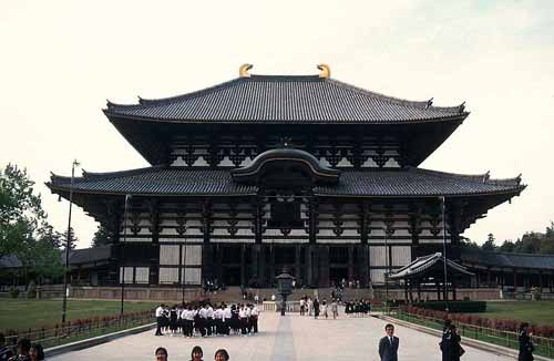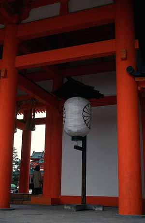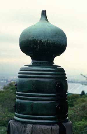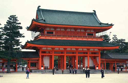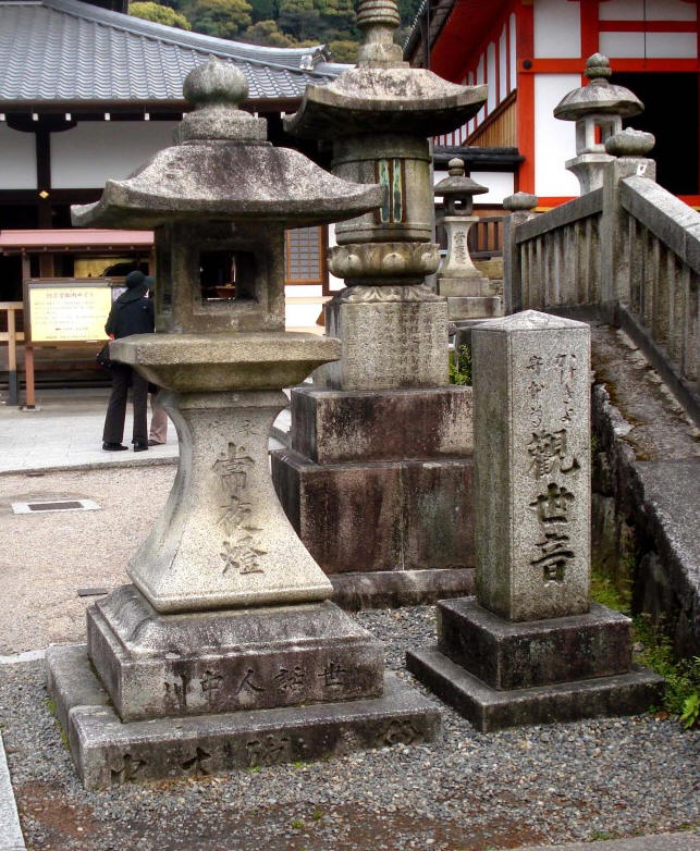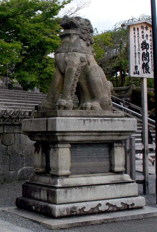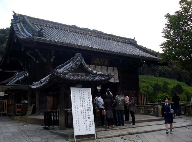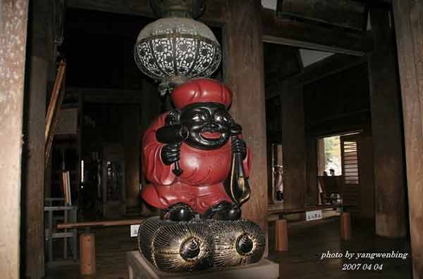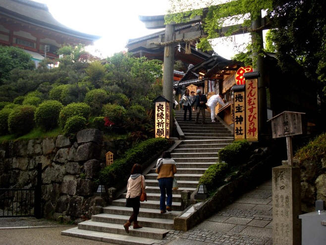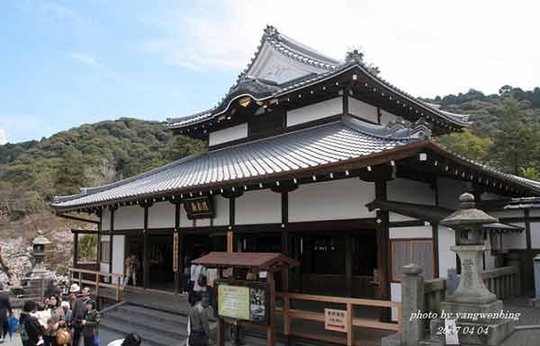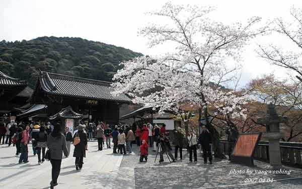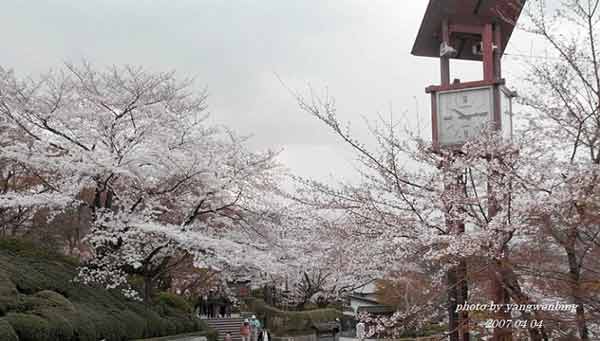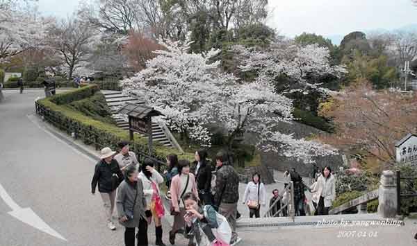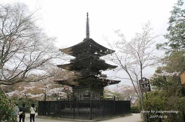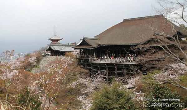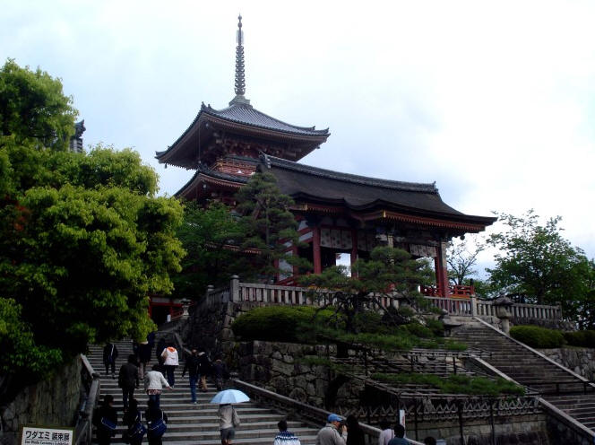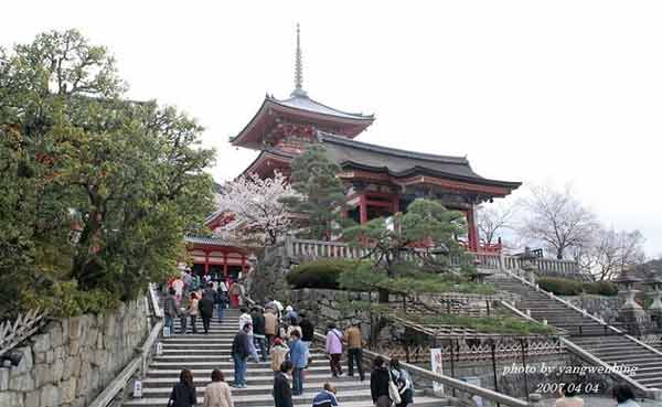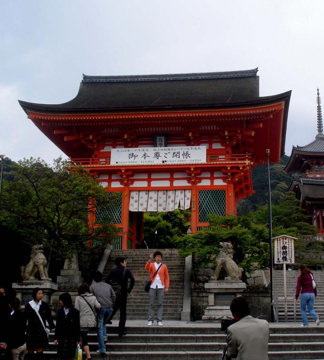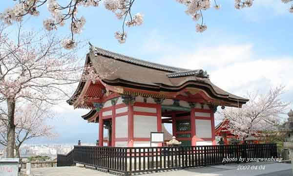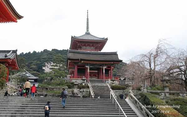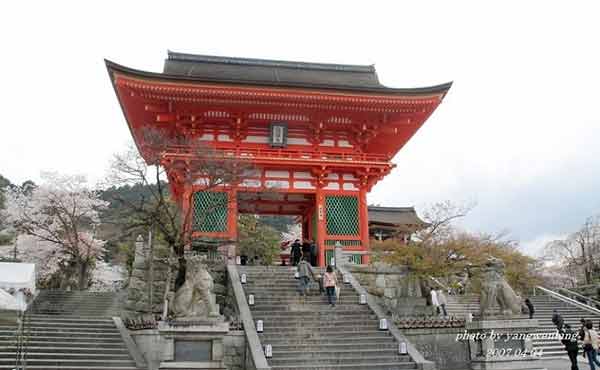 舞台下面是音羽瀑布,清水飞流直下,景色壮观,故名清水寺。山谷的对面是著名的平安塔,据说因祈祷平安分娩灵验而远近闻名。仁王门两侧高达4米的仁王像,可谓京都之最,三门塔红漆艳丽夺目。