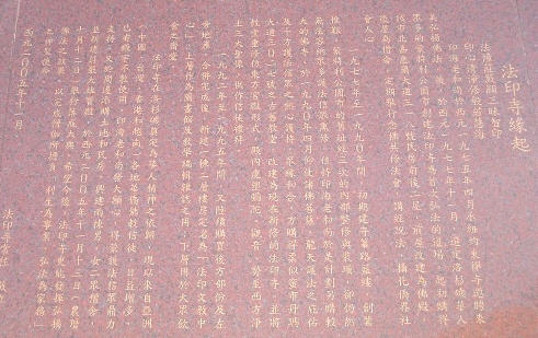一九七七年至一九九0年间,初期建寺筚路蓝缕,创业惟艰。蒙特利公园市的旧址经三次的内部整修与装潢,却仍然无法容纳众多护法信众熏修,住持印海老和尚于是计划另购较大的佛寺。于一九九0年四月仰仗诸佛菩萨、龙天护法之庇佑及十方护法信众之热心护持,众缘和合,方购得柔似蜜市刁玛大道三0二七号之古旧教堂,改建为现在新修的法印寺。并将教堂重修仿东方宫殿形式,殿内虔塑弥陀、观音、势至西方净土三大圣像,供作信徒礼拜。
