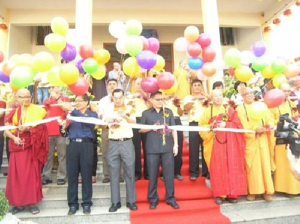 梁劍順(中)與順南法師(左起)、梁金福、鄧福樂及圓鳴法師(右2)、傳孝長老(右3)以及貴賓們聯合剪綵。
