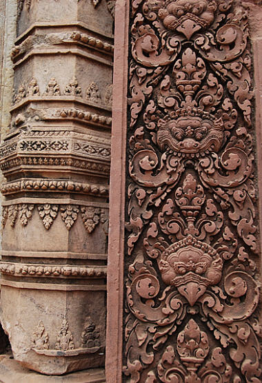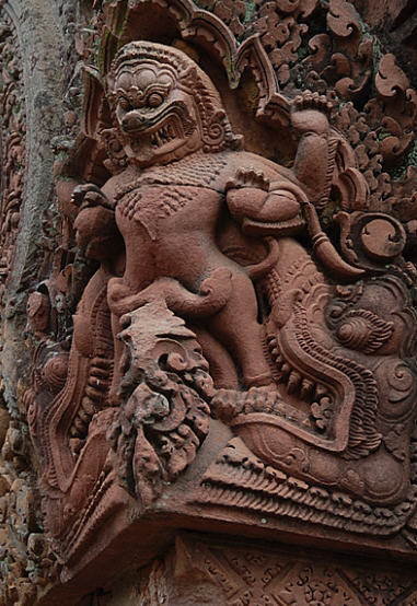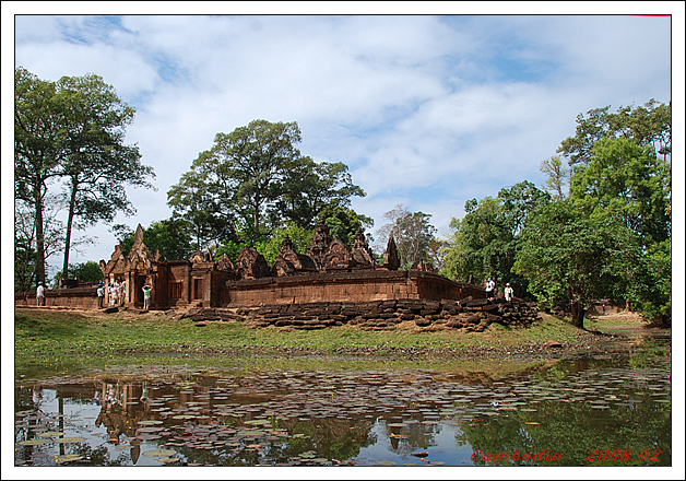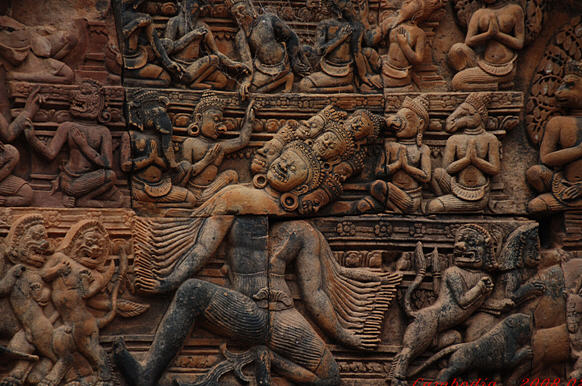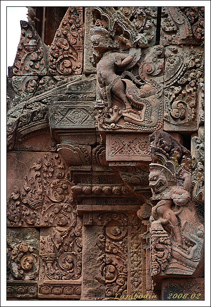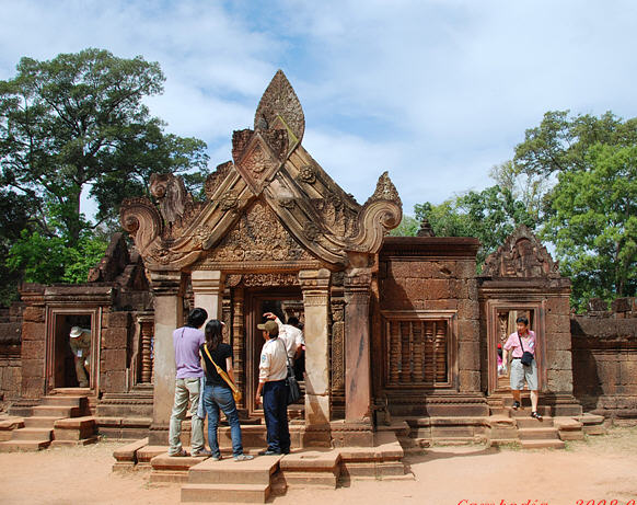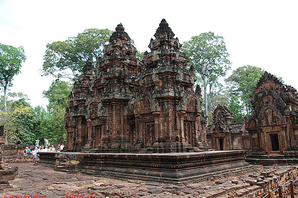 柬埔寨斑蒂丝蕾寺 距离吴哥窟20多公里,是一座印度教与佛教相融合的精美小巧建筑群。由于它的雕刻精致华丽,尤其是建筑物上许多女性的雕像美丽妩媚,被当初“发现”它的法国人认为是吴哥王朝嫔妃居住的宫殿。于是人们就称斑蒂丝蕾为“女皇宫”。其实,根据史书记载斑蒂丝蕾是一所供得道高僧居住隐修的寺院。