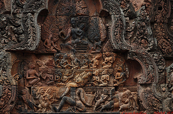 斑蒂丝蕾整个建筑群采用的是柬埔寨特有的粉红色砂砾岩砌筑而成。当年的能工巧匠们在这些粉红色砂砾岩上雕刻了许许多多复杂细密、独特精美的花纹图案和神话故事,栩栩如生地展示了不朽的艺术风格。寺庙的门楣与立柱上雕刻着精致的图案或飞翔的动物,石壁上雕刻着许多婀娜多姿、神态各异的美丽女神,其中一尊被誉为“东方的蒙娜丽莎”。最精彩的是雕刻在门楣上的一个神话故事:湿婆神拥抱妻子坐在五重山上,恶魔变幻出无数个头和手臂,大地震动猴子狮子和大象奔跑躲避,神鸟向四面飞翔。斑蒂丝蕾壁画的雕刻艺术是所有吴哥古迹中最精致细美的,享有“吴哥艺术之钻”的美誉。