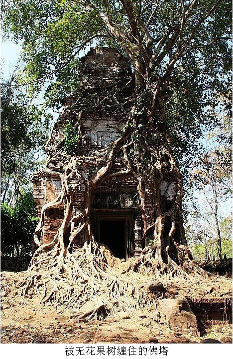 虽说这些寺庙无法与印度宏伟、精美的神庙相媲美,但其本身简朴的外形在高大树木的衬托下透出的那种荒凉、神秘和沧桑的美感却是独一无二的,即使现在到访的游客数量在不断增加,置身其间,还是能感受到一种只属于这儿的特殊气氛。现在主要的建筑有30座,专家相信过去还有100座较小的神庙,如今这些大大小小的寺庙仿佛天上的星星散落在森林的各个角落,而每座都会带给游人不同的惊喜。走过红庙(Prasat Krahom)门前残破的狮子,你就会看到这座直插苍穹的金字塔型建筑Prasat Thnom寺。这座金字塔宽55 米,高40米,赫然出现在眼前时,真让人不禁屏住呼吸。吴哥窟的高塔,一般四面都 有楼梯上去,而这座金字塔,却只有正面一条石阶通向顶端。石阶早已倒塌得无法攀爬,一条破破烂烂的木梯靠在上面,中间一段已经完全腐坏,挂着个大大的“禁止攀爬”的牌子。