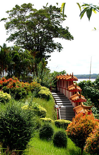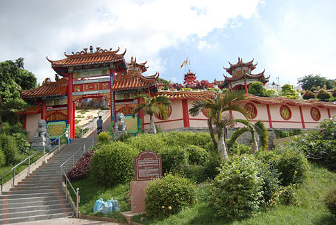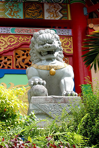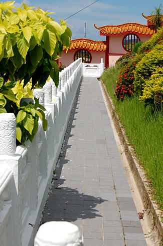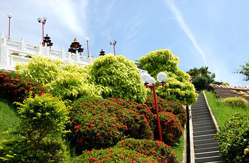 如同介绍手册上说的,此处为砂劳越最具佛教象征与园艺化的佛庙。这里的园艺真的非常的棒,然而却又非是造作剪裁类的,感觉上庙的周围的花草自然丰美,非 常养眼。也许是花木的颜色安置甚好,也许此处土壤甚佳,再来是园丁辛勤,又或者风水奇佳,获得神灵庇佑,也说不定。总之,被吸引的不仅是我,还包括蜜蜂、 蝴蝶、鸟儿和不知名的昆虫。
