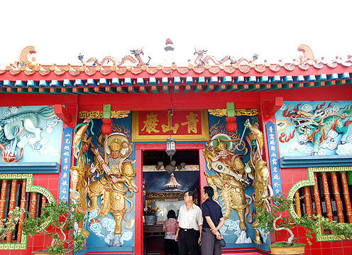 这所庙宇称为青山岩,位于古晋砂劳越河口左岸,海拔120 英尺的山丘上,占地2.5 英亩,距离古晋以河道交通计算(从砂劳越河水闸外作起点),大约15 海里,以陆路计算(取道砂劳越河长堤)大约30 公里。它是古晋北市管辖地区内在Kampung Muara Tebas的一所大佛庙。Kampung Muara Tebas 为一马来渔村。这里民族和谐,充满宗教容忍与谅解,马来西亚的星报(The Star ) 在1998 年8月31日马来西亚国庆日特刊上形容 Kampung Muara Tebas 是宗教最和谐的地方。砂劳越旅游部在2001 年出版的砂劳越大全里列青山岩为砂劳越最具佛教象征的佛庙寺与最具有园艺化的佛庙园地。