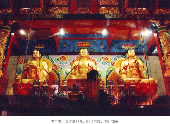 中间佛龛:释迦牟尼佛、阿弥陀佛、药师佛